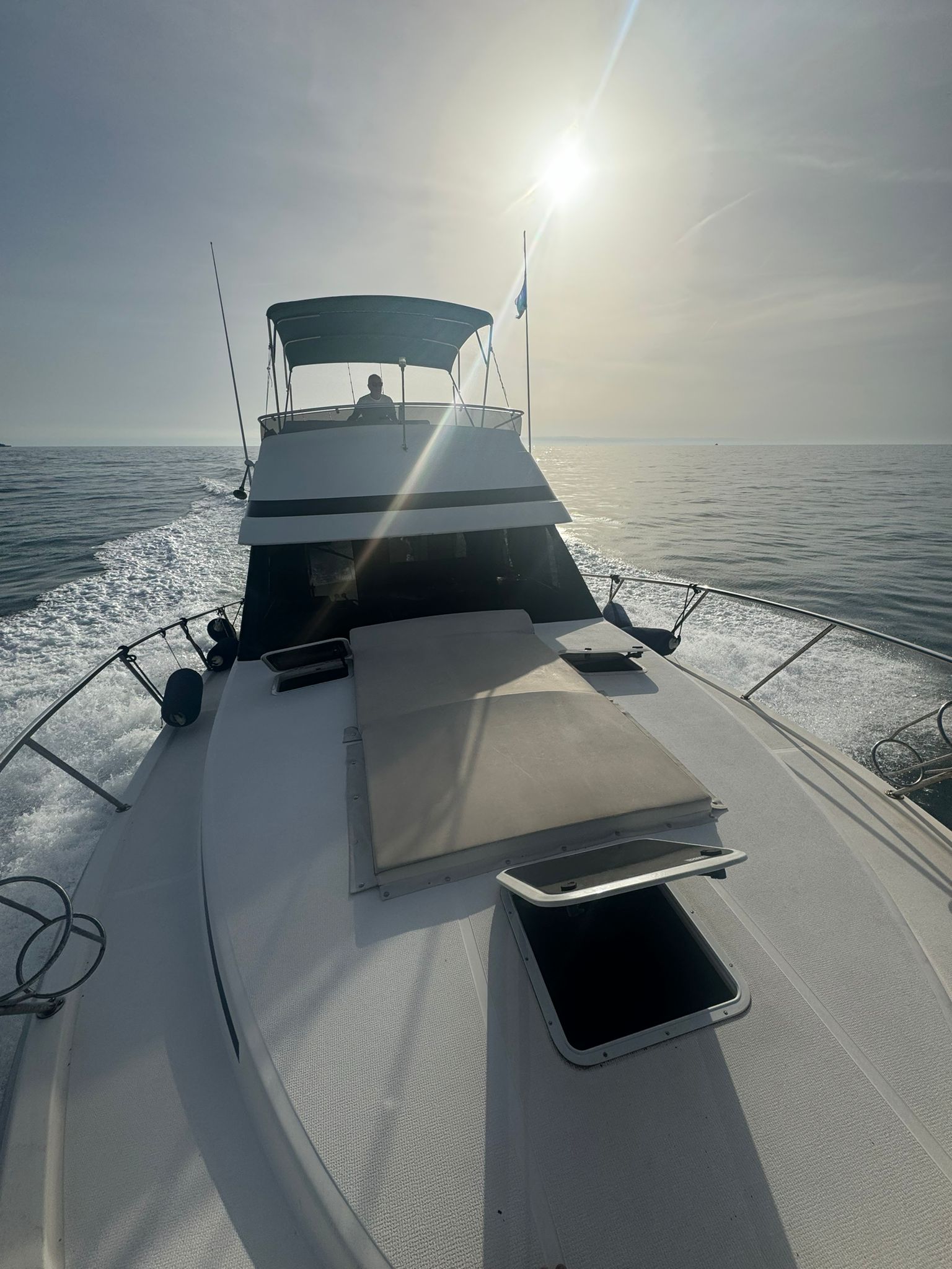 Riviera 36, Lunghezza 11 metri, ha due motori da 275 CV ed è attrezzata con scialuppa di salvataggio. Dentro è suddivisa con una camera da letto matrimoniale, una camera con 2 letti a castello, bagno e cucina.